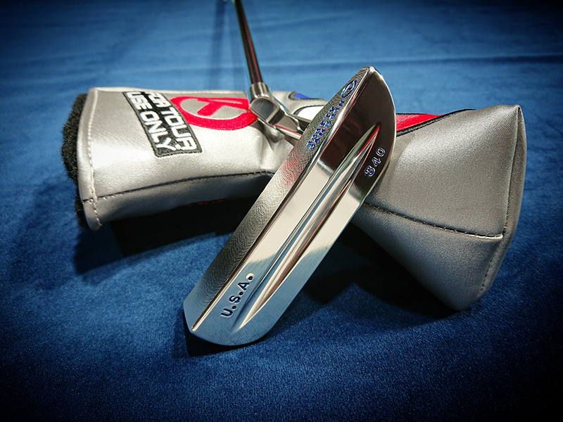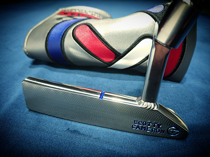 "Hand" stamp and CRAFTED on the back. SCOTTY CAMERON and Circle-T on the face heel. 340 and U.S.A. on the sole. Bullet-bottom sole. It has a topline. Grip : Blue leather perforated Headcover : Stick Figure Circle-T Silver USA