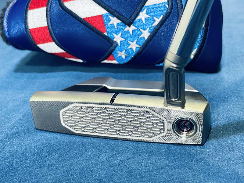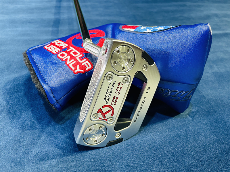 3 Cherry bombs on the backcavity. Circle-T in the left bomb. SCOTTY CAMERON on the heel of the face. SCOTTY CAMERON, FASTBACK1.5 , FOR TOUR USE ONLY, on the sole. Circle-T and 20 on the sole weights. It has a topline. Grip: Circle-T full-contact Black/White Headcover: Induatrial Circle-T USA Blue