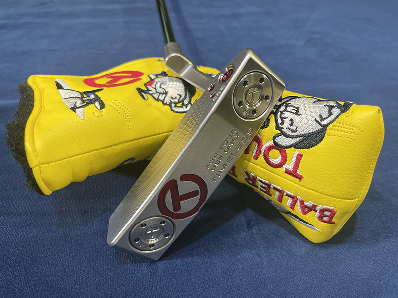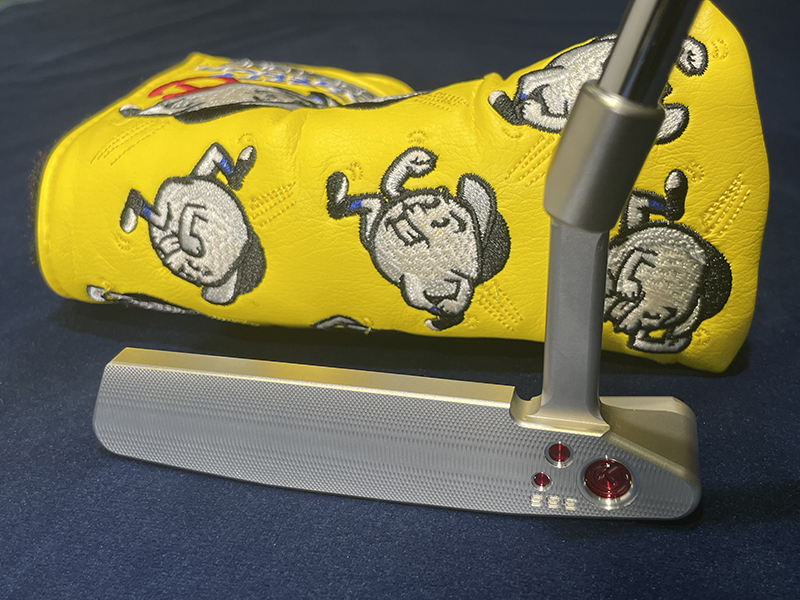 Double milled bombs, Circle-T, TOURTYPE SSS and SCOTTY CAMERON on the backcavity. Double milled bombs, Circle-T and SSS on the heel side of the face. Circle-T, TIMELESS and FOR TOUR USE ONLY on the sole. Circle-T weights T30g. It has a flangeline. Grip: Pistolini Plus Circle-T Black/White Headcover : Baller Boy Circle-T Yellow